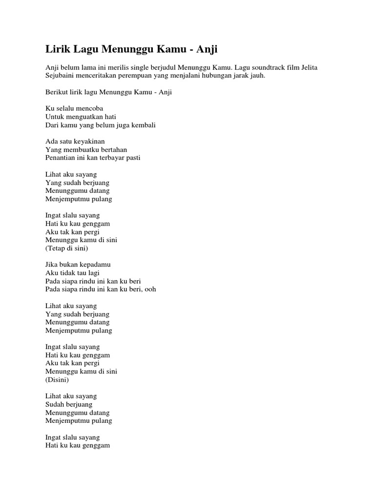 Berikut lirik lagu Menunggu Kamu yang dipopulerkan by Anji. Intro C G Am G F C G Verse C G Am G Ku selalu mencoba F Em Dm Untuk menguatkan hati Em C F G Dari kamu yang belum juga kembali Verse C G Am G. C E Lihat aku sayang Am A yang sudah berjuang Dm A Menunggumu datang Dm G Menjemputmu pulang.